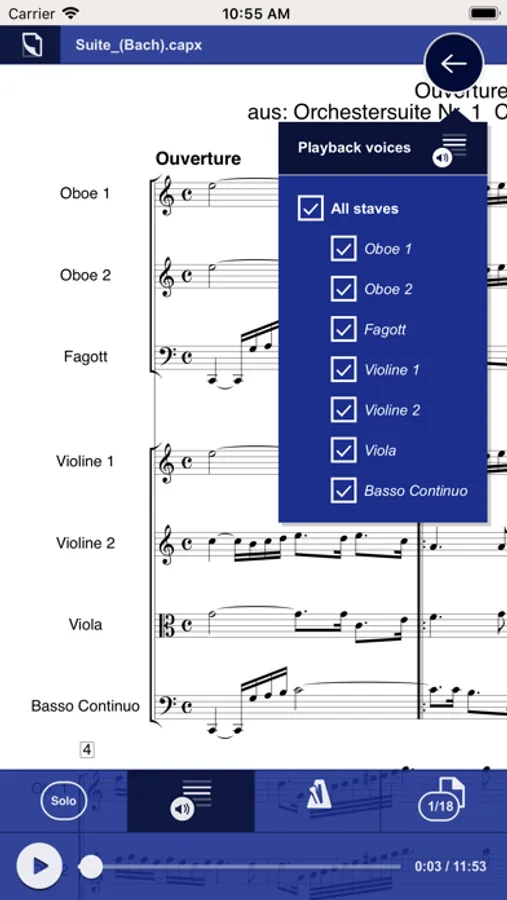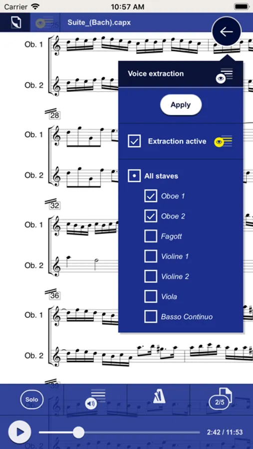 Select the Solo button to listen to one single voice. Solo on/off – this can be done during playback at any position in the piece. This way you learn your part efficiently.