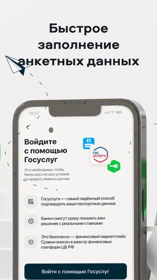 Все данные, которые вы оставляете в приложении, надёжно защищены протоколом SSL. При обработке персональных данных АО «Финансовый Маркетплейс Сравни.ру» соблюдает принципы и правила обработки персональных данных, предусмотренные Федеральным законом РФ от 27.07.2006 г. № 152-ФЗ «О персональных данных».