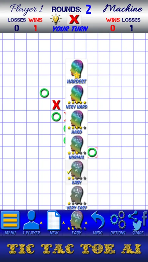AI technology is designed with 6 levels to serve the player from beginner to highly capable opponent with many years at school. The levels from Very Easy for beginner to Hardest for grandmaster.