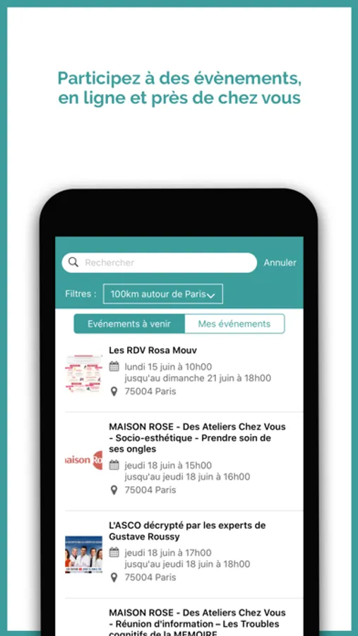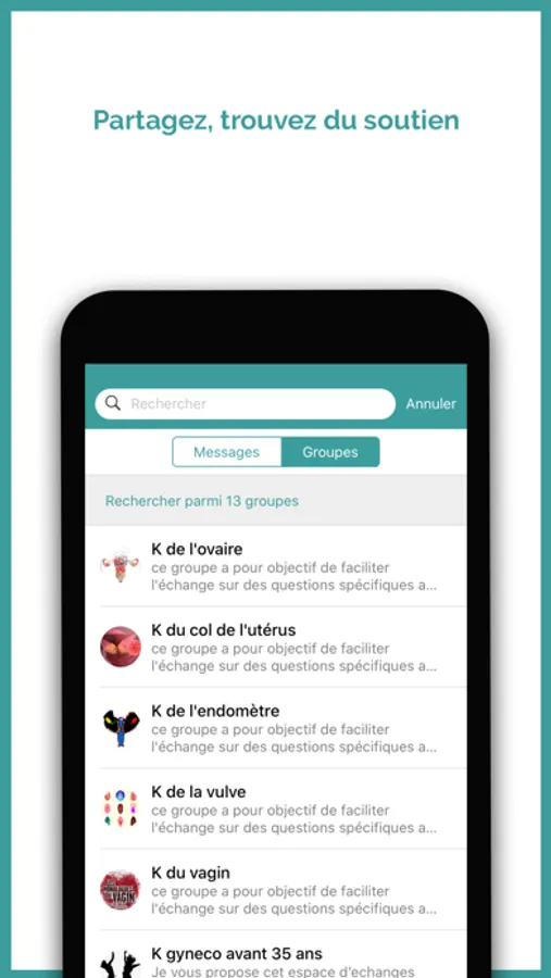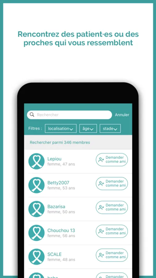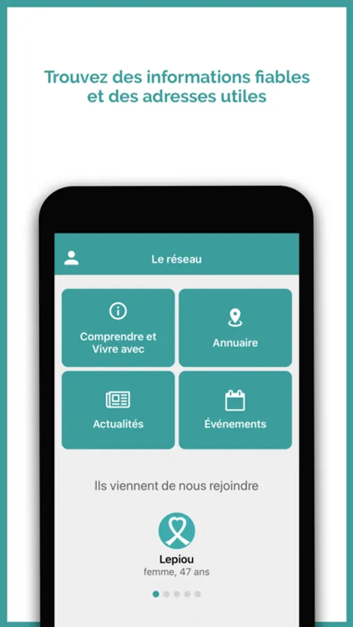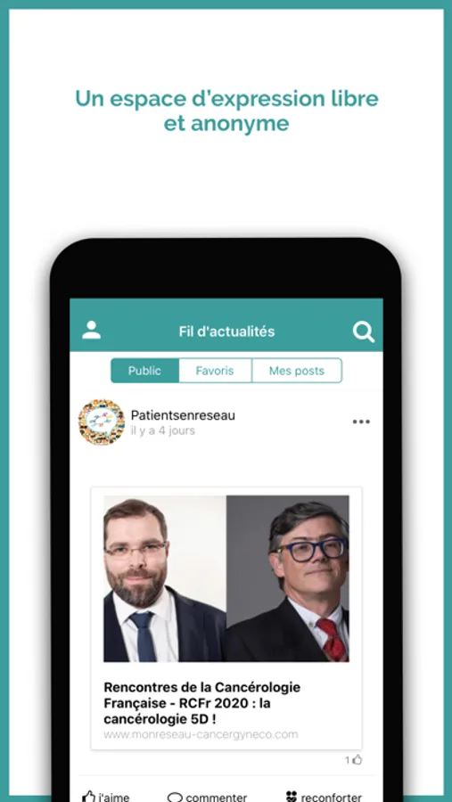 Réseau social sécurisé, anonymisé, modéré et gratuit qui favorise le partage et le soutien entre malades ou proches quelque soit le moment ou le lieu de vie, facilite l’accès aux professionnels et associations de proximité et le recours à une information utile et fiable.