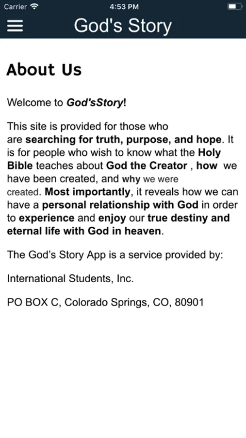 This app is place for those who are searching for truth, purpose, and hope. It is for people who wish to know what the Holy Bible teaches about God the Creator, how we have been created, and why we were created. Most importantly, it reveals how we can have a personal relationship with God in order to experience and enjoy our true destiny and eternal life with God in heaven.