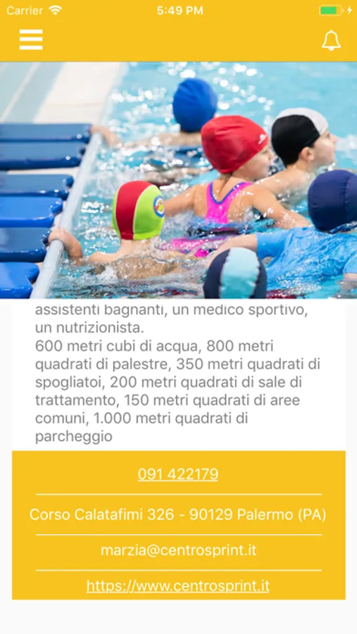 La Sprint Sport Center è ubicata a Palermo, in Corso Calatafimi 326. Una piscina da 25 metri regolamentare, una piscina riservata esclusivamente ai bambini e all’Aquafitness. Una palestra con tre sale per il fitness musicale, una sala pesi, preparazione atletica e cardio-fitness, una sala Indoor Cycling e Walking, la scuola di Ginnastica Artistica Maschile e Femminile, la scuola di Danza. Un centro di attività preventiva e curativa, un centro di valutazione funzionale. Bar, Parcheggio. Un direttore sportivo, sei allenatori federali, nove istruttori federali, tre assistenti bagnanti, un medico sportivo, una nutrizionista… Seicento metri cubi di acqua, ottocento metri quadrati di palestre, trecentocinquanta metri quadrati di spogliatoi, duecento metri quadrati di sale di trattamento, centocinquanta metri quadrati di aree comuni, mille metri quadrati di parcheggio.