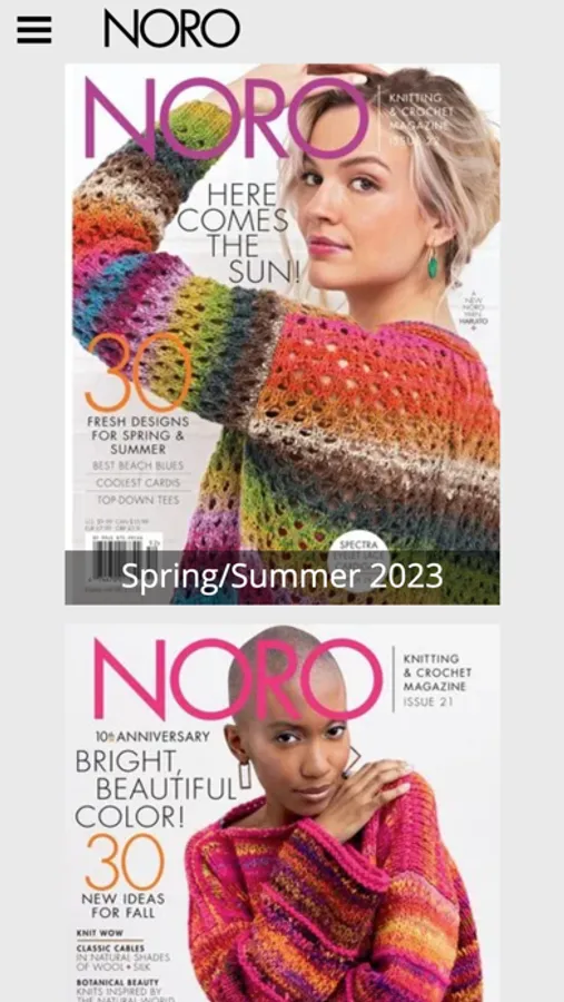 Having trouble finding your favorite pattern from the NORO magazine? or impossible to find a back issue? By subscribing to this app, you unlock hundreds of patterns from the NORO Magazine, as well as enjoying all the past features, articles, and content. Enjoy at your leisure!