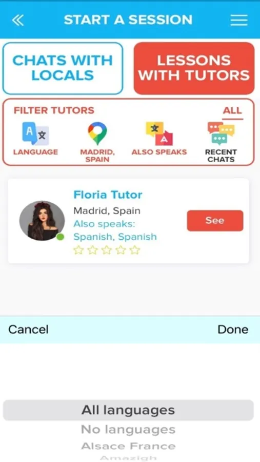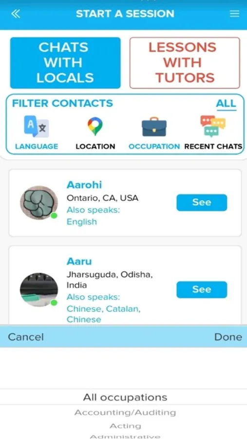 2. Practice for free anytime with native speakers like you from all over the globe. Filter contacts by language, location, and occupation. No appointement needed. Just 1 Click 2 Speak.