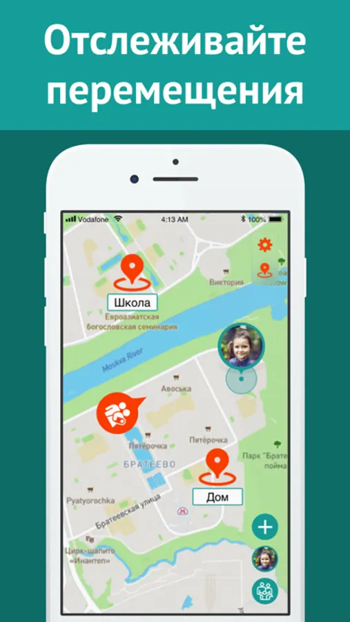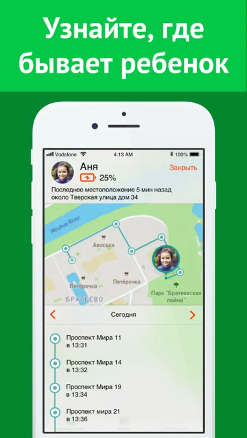 Приложение создано для родителей, которые заботятся о безопасности своих детей. История перемещения детей, избранные места с уведомлениями о посещениях, данные смартфона ребенка и многое другое: