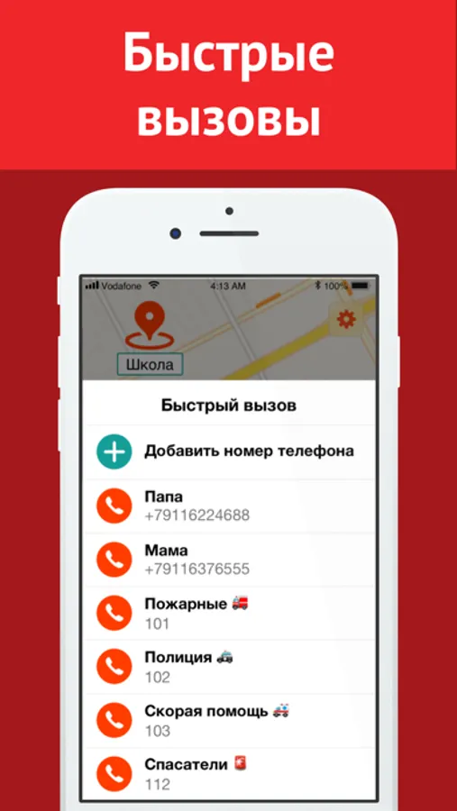 Ребенок может быстро вызвать экстренную службу или позвонить своим родителям прямо из приложения, возможность добавления собственных номеров