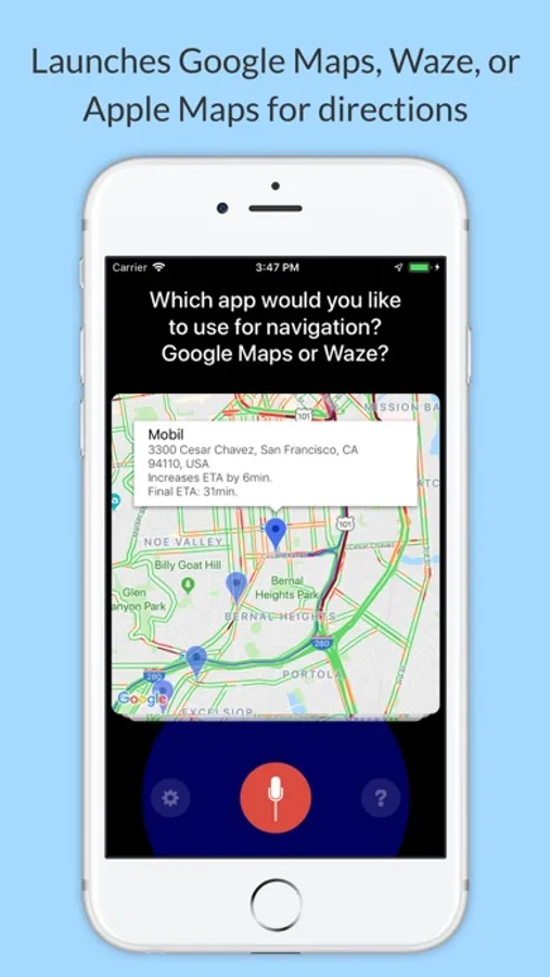 - Launches directions using your favorite app: Google Maps, Waze, or Apple Maps.