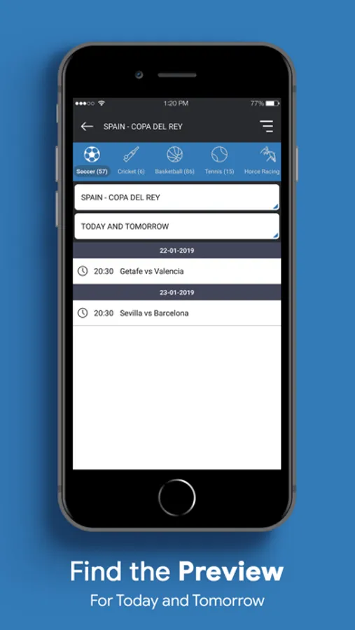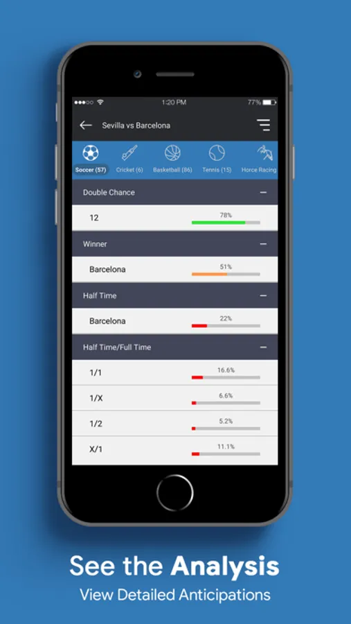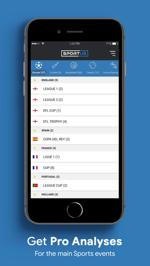 The Sportus App provides Professional Analyses for several sports, such as Football, Cricket, Basketball, Tennis, Horse Racing, Baseball, American Football, Ice Hockey, Esports, Greyhound, Rugby Union, Rugby League and Australian Rules.