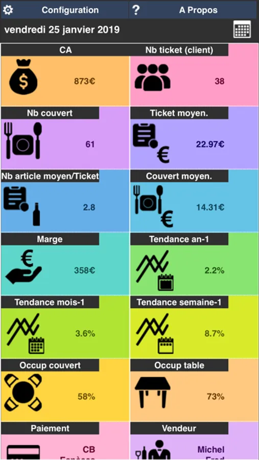 Solution mobile de visualisation des résultats simplifiés des encaissements réalisés sur la solution UPOS Premium by UltimaSOFT (couvert moyen, tables ouverte, chiffre affaires, marges, occupation...).