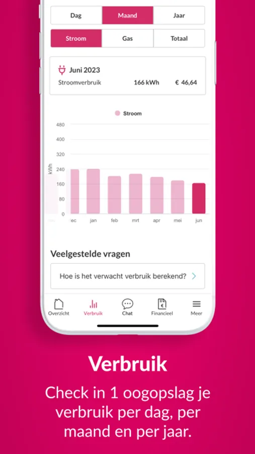 Je ziet in 1 oogopslag je verbruik per dag, per maand en per jaar. Per maand en per jaar zie je ook de kosten van je verbruik.