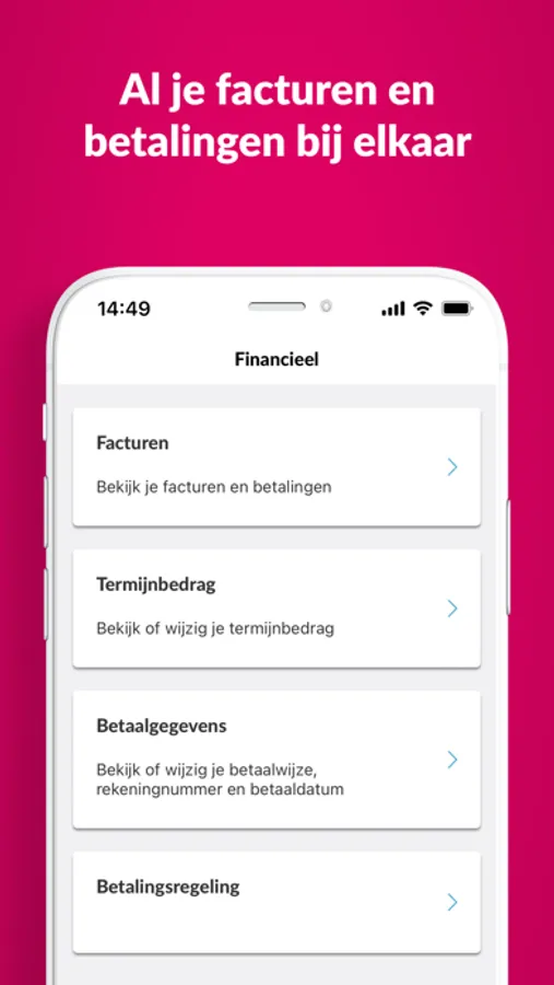 Je past je persoonlijke gegevens eenvoudig aan, zoals wachtwoord, e-mailadres en telefoonnummer. En je bekijkt je maandelijkse facturen en jaarrekeningen in de app.