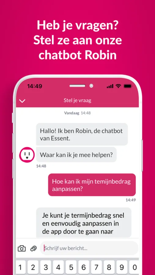 In de VerbruiksManager+ app van Essent regel je al je energiezaken zelf. Check je verbruik en pas je termijnbedrag aan als dat nodig is. Zo houd je grip op je kosten. En heb je vragen? Stel ze direct aan onze chatbot Robin.