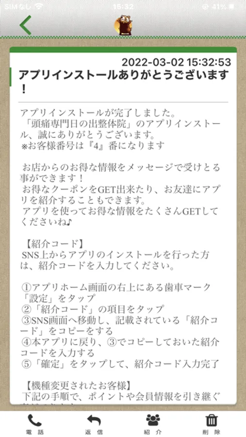 日の出整体院のアプリをSNSを通じてお友達に紹介する事ができます。