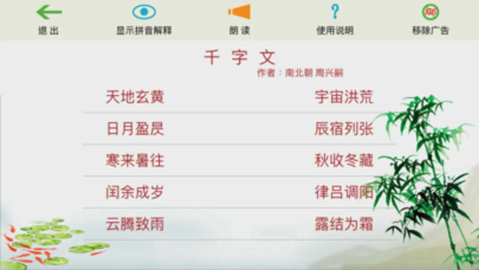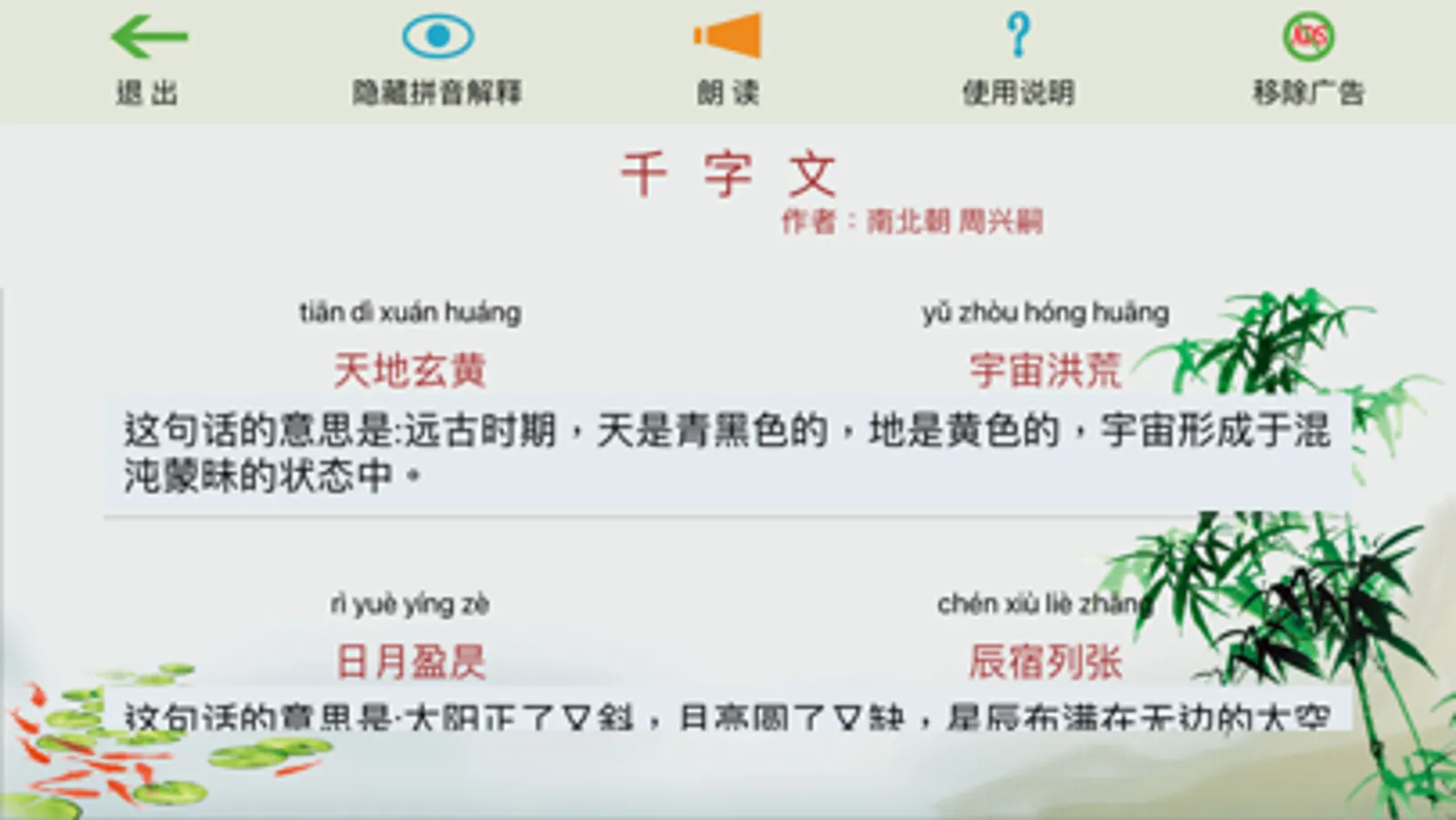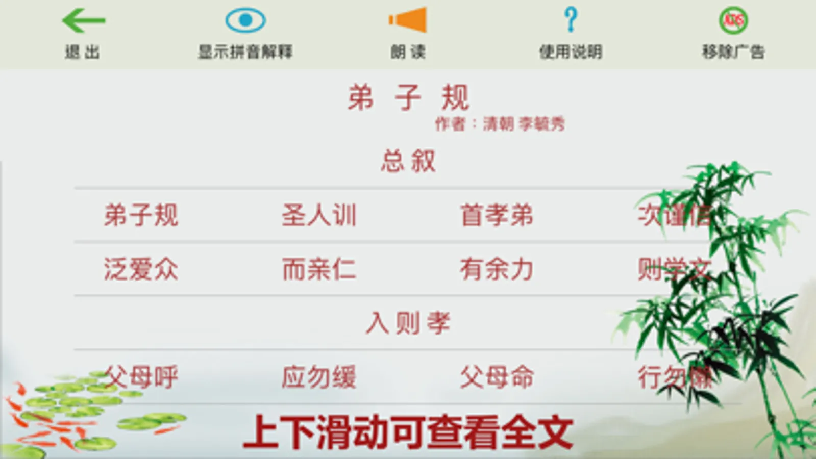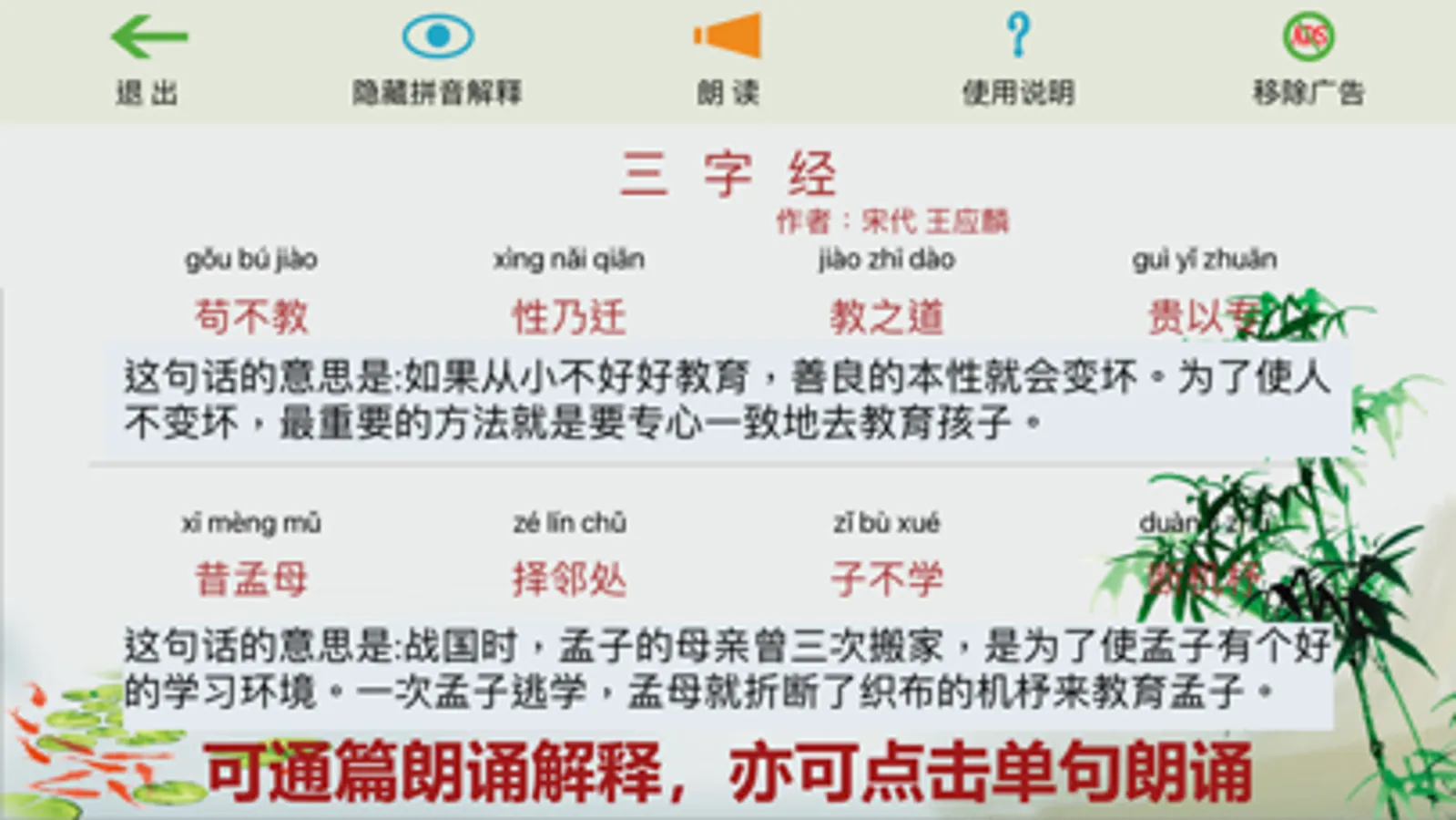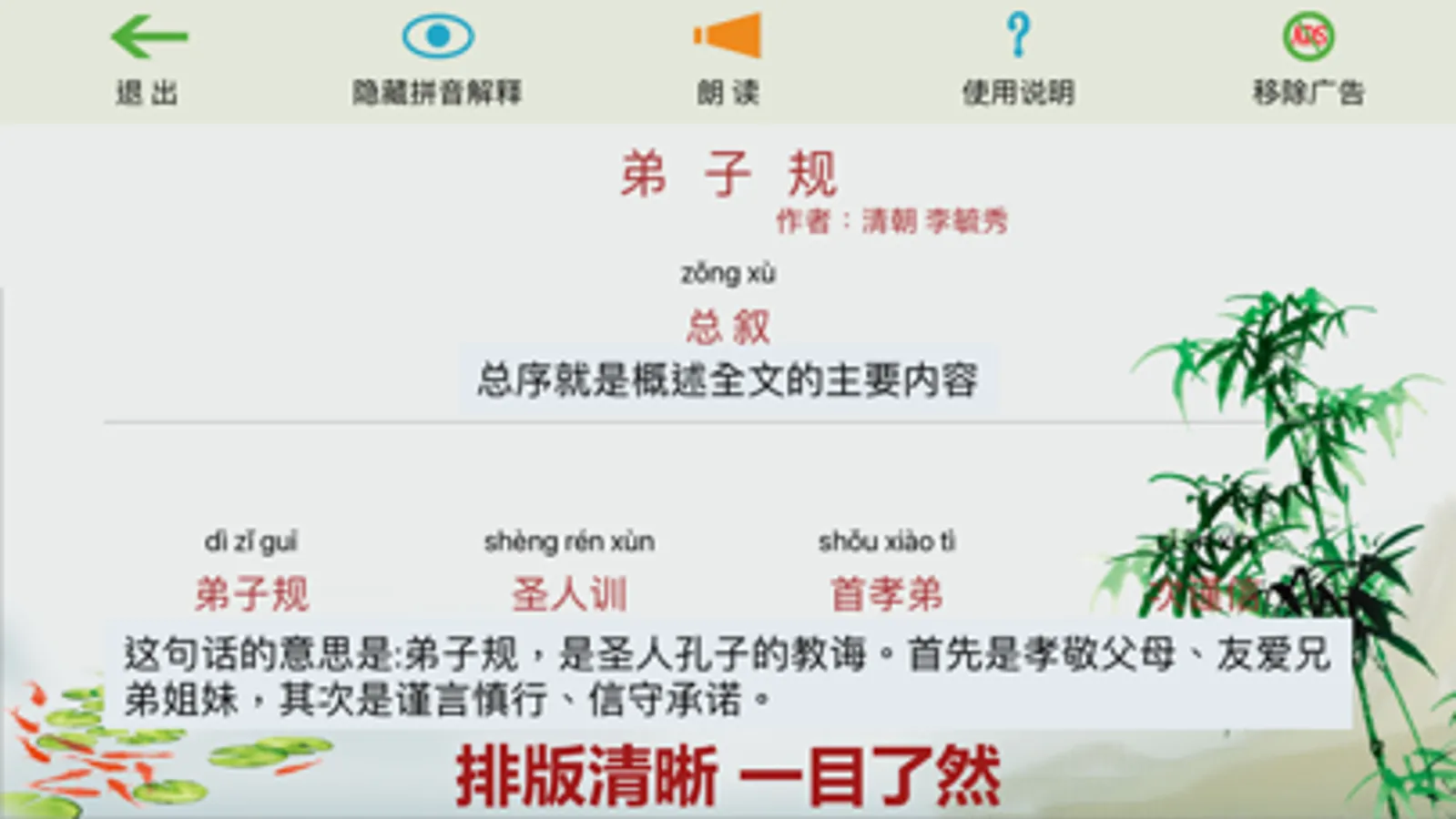 本软件集合了千古名篇国学经典, 支持正文朗诵,正文和解释朗诵, 单句朗诵, 通篇朗诵支持音频和文字同步展示, 让大家更好的学习国学经典。 此软件正在努力制作儿童国学启蒙《三字经》《弟子规》《千字文》,儒家经典《论语》《大学》《孟子》,道家经典《道德经》《鬼谷子》,兵家经典《三十六计》《孙子兵法》,法家经典《商君书》《韩非子》等国学经典,还包括很多千古名篇,如反思爱国的《六国论》《过秦论》《阿房宫赋》,让人励志热爱学习的《师说》《劝学》《报任安说》,感人肺腑的《出师表》等等,有些已经上线,有些还在努力制作中,这是一项工程量巨大的工作,需要花费很多时间去学习,校正,配音朗诵等,这个app不单给大家用,我自己和家人朋友也一样使用学习,制作很不容易,非常感谢大家的支持!