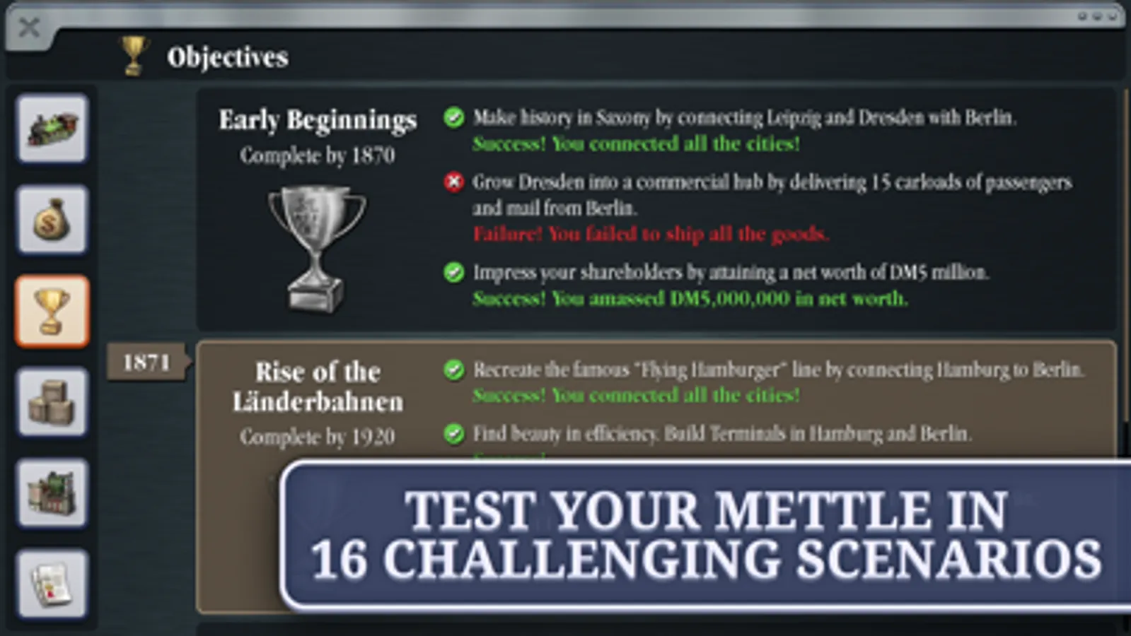 Test your entrepreneurial mettle in a mix of historical and fictional scenarios, each with a distinctive map and unique objectives. Establish the first passenger line in 1830s Great Britain, stitch together the American West during the Gold Rush, or help Santa with the Christmas rush at the North Pole!