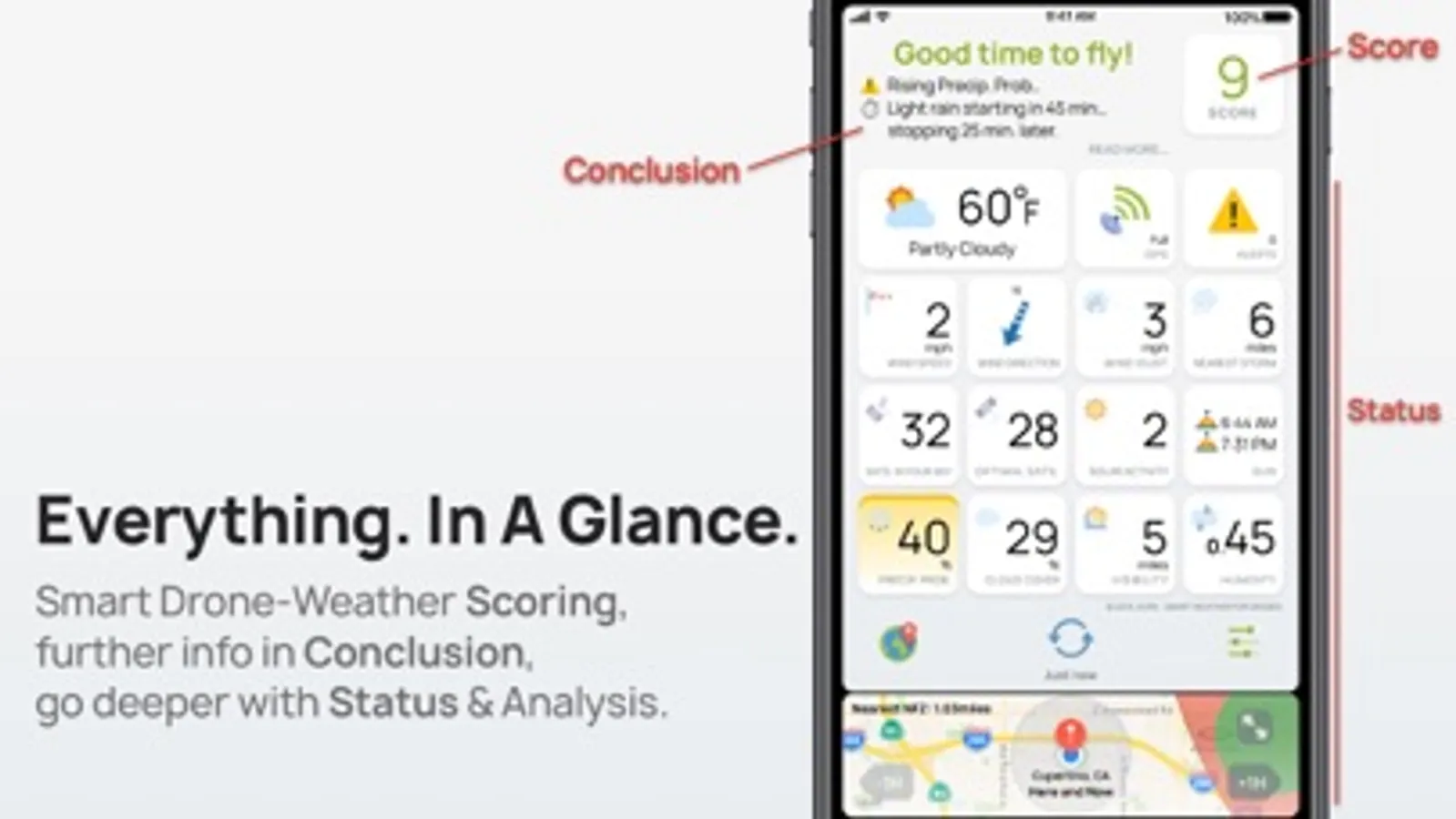 We take into account all weather & space elements that are important to drone flights (such as wind, satellites, No-Fly Zones, solar activity, etc.) and put them all together on a WELL DESIGNED INTERFACE. This makes it easier to view all the critical information in a single view, without having to navigate around to different pages.