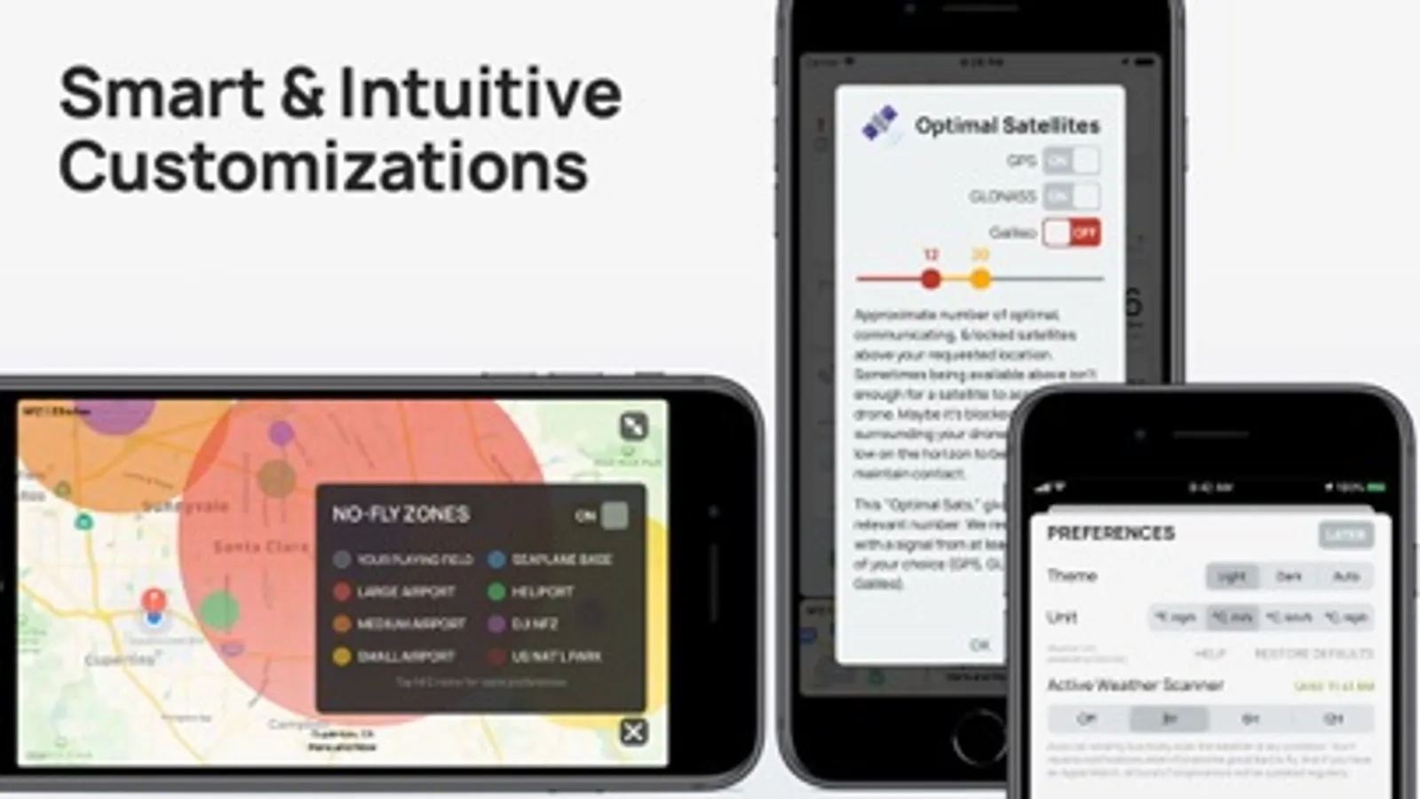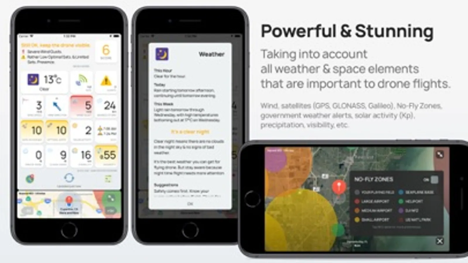 • Wind, satellites (GPS, GLONASS, Galileo), No-Fly Zones, government weather alerts, atmospheric pressure, solar activity (Kp), precipitation, visibility, etc.