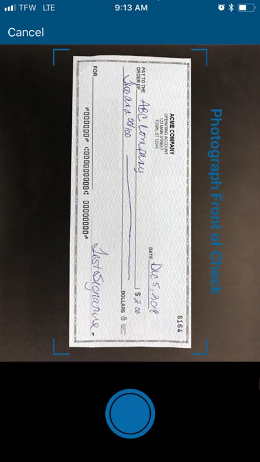 Take a photo of your check and upload the image to the Business Mobile Remote Deposit app in order to electronically deposit into your account.