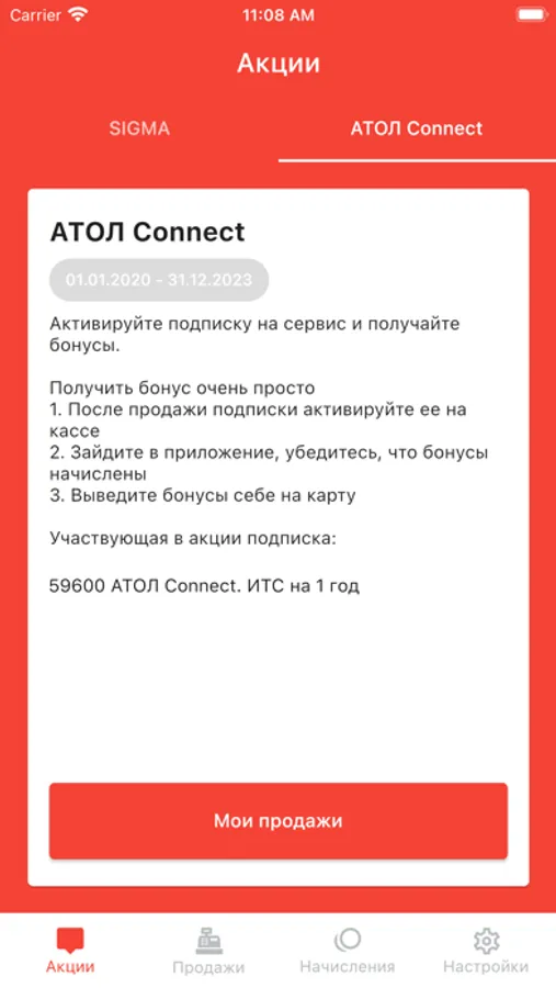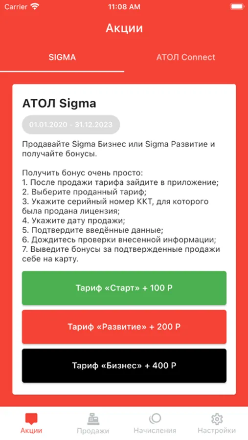 В рамках мотивационной программы бонусные баллы начисляются за активации/продление тарифов АТОЛ SIGMA, а также за активации подписок АТОЛ Connect.