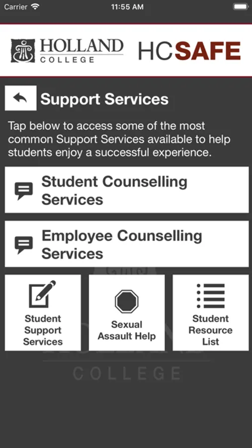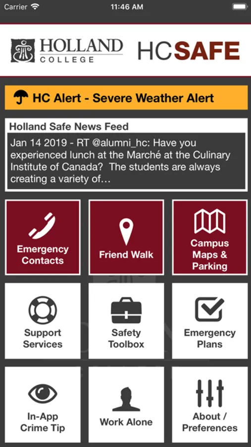 HC SAFE is the official safety app of Holland College. It is the only app that integrates with Holland College's safety and security systems. Holland College has worked to develop a unique app that provides students, faculty and staff with added safety on the Holland College campus. The app will send you important safety alerts and provide instant access to campus safety resources.