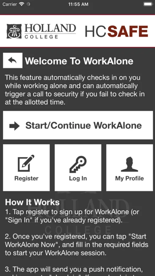 - WorkAlone: Use the app to "check in" with you periodically while working alone or during late hours. If you don't respond, the app will alert your emergency contact.