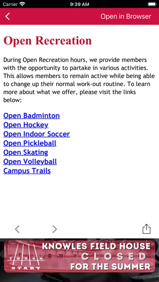 View hours of operation of Fitness Center, Climbing Gym, Knowles Field House, Ramer Field & Outdoor running track,