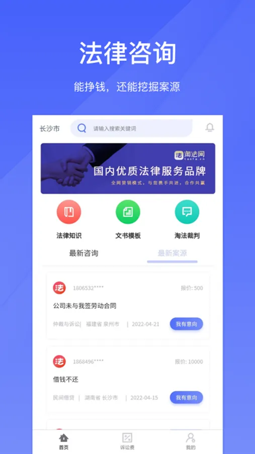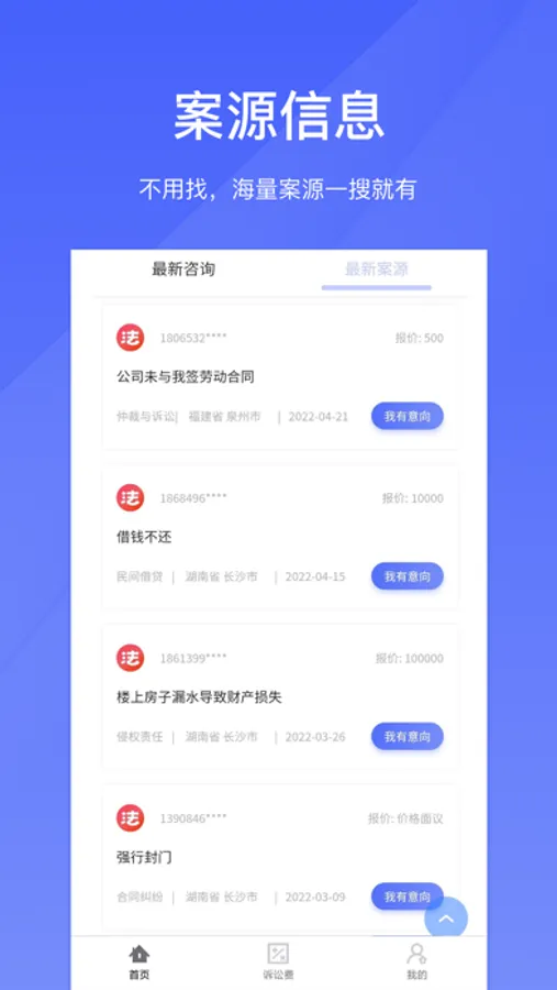 二、【案源竞拍】 淘法有全国各地海量案源发布,您随时可以通过淘法提交方案,联系当事人获取案源。