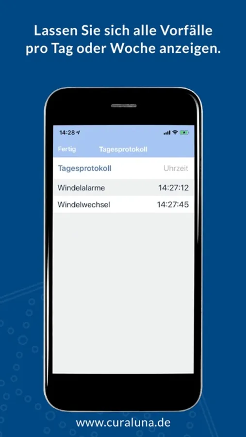Sie können jederzeit nachschauen, wie oft und wann Alarm gegeben wurde. Und wann welche Windelwechsel geschahen.