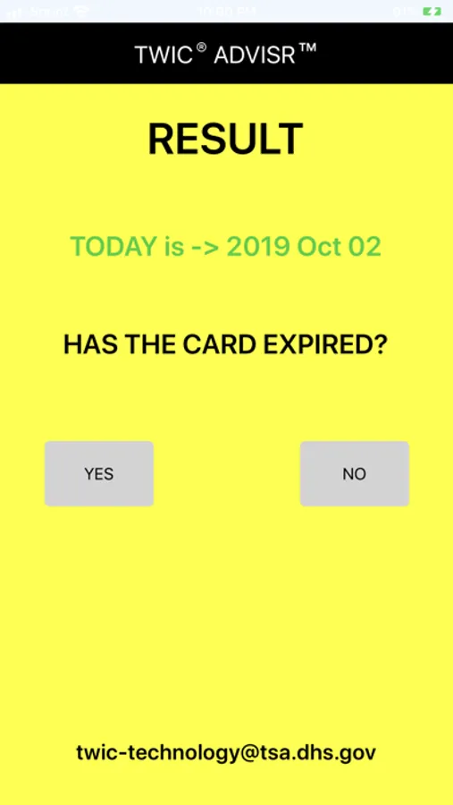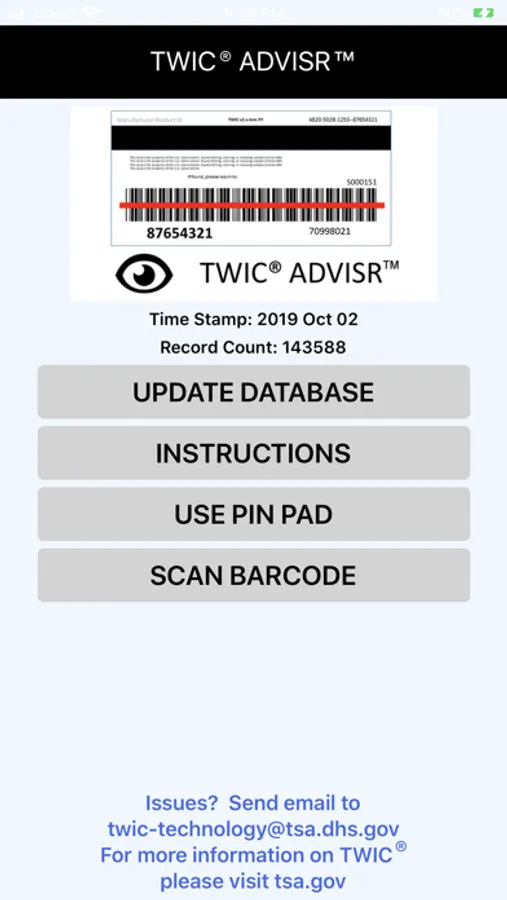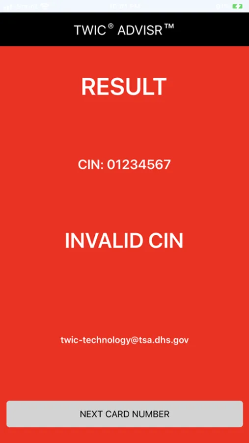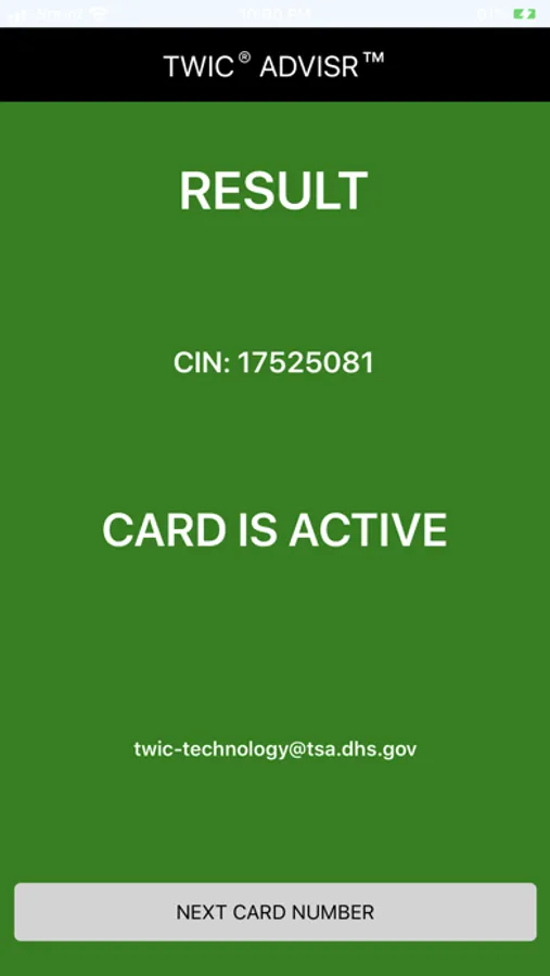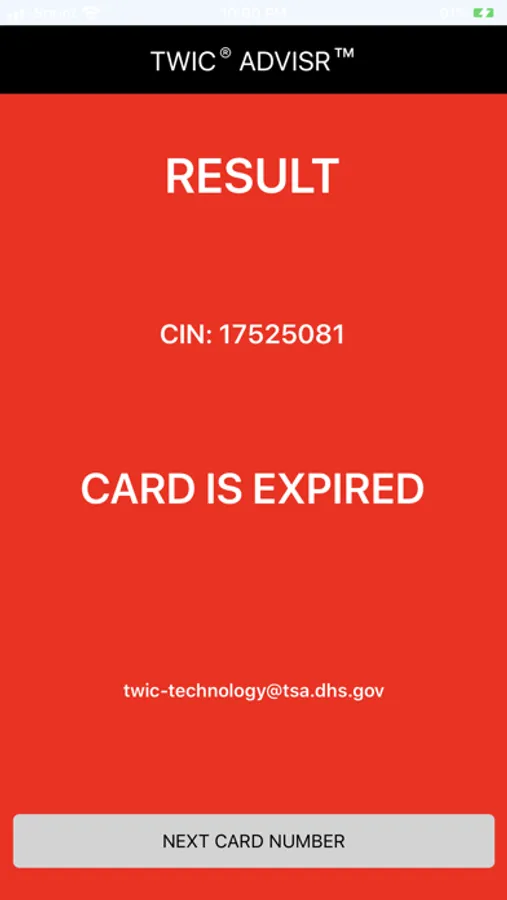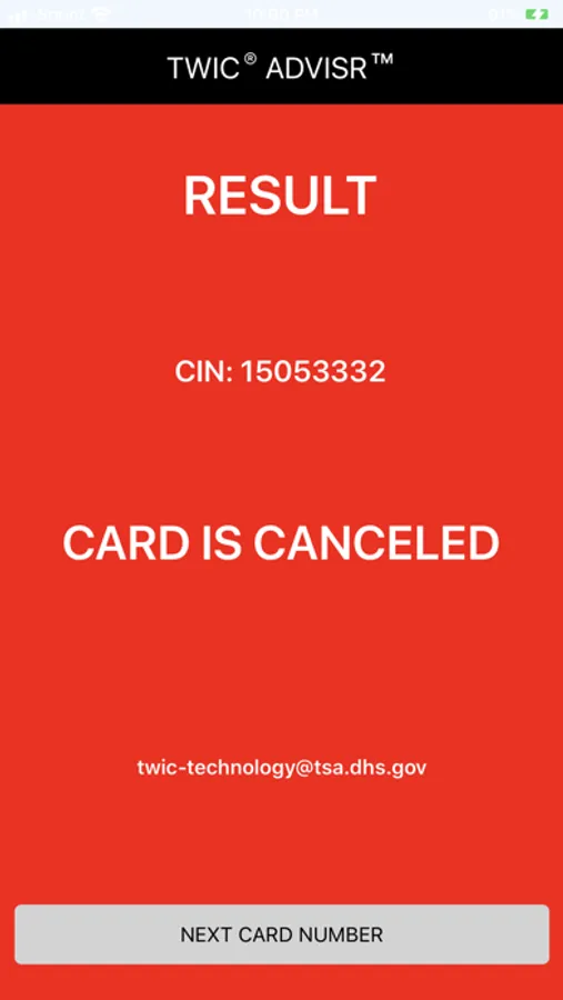 Uses the Credential Identification Number (CIN) printed on the back of the TWIC card and compares it against a List of Canceled CIN Numbers (LCCN) to determine if the card has been canceled. The CIN can be entered via a keypad or the barcode can be scanned via the device's camera. If the CIN is found on the list, the display indicates the card is canceled. If the CIN is not on the list, the operator is prompted to check the expiration date printed on the front of the card. If the card is expired, the display indicates to the operator that it is expired. If it has not expired, the display indicates that the card has not been canceled.