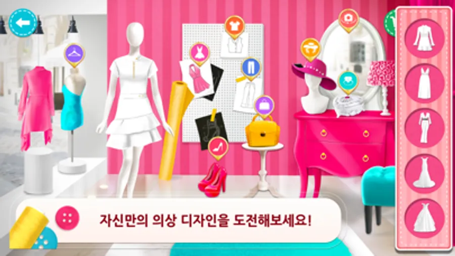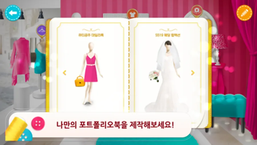 패션(의상, 핸드백, 슈즈) 디자인을 선택하고, 스크롤 바를 움직여 다양한