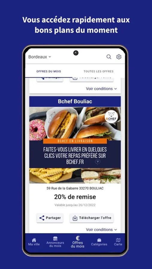 les offres commerçantes seront téléchargeables par l utilisateur ou l utilisatrice pour qu'il puisse le montrer au commerçant en question avec l offre commerciale indiquée sur le coupon téléchargé.
