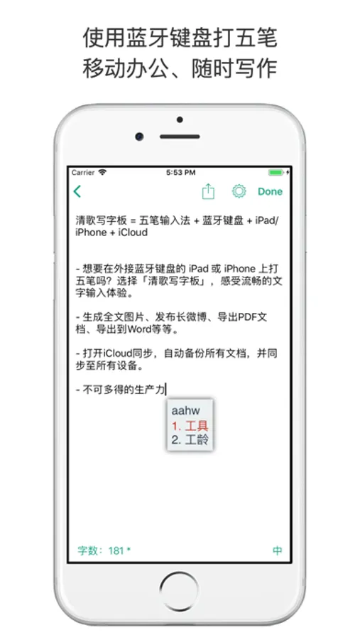 「清歌写字板」还提供了如文字导出图片、文字导出PDF文档、发长微博、iCloud同步备份等实用功能。即使不使用外接键盘,不打五笔,「清歌写字板」同样可以作为一款不错的笔记App,可以高效率地应用于文字处理。