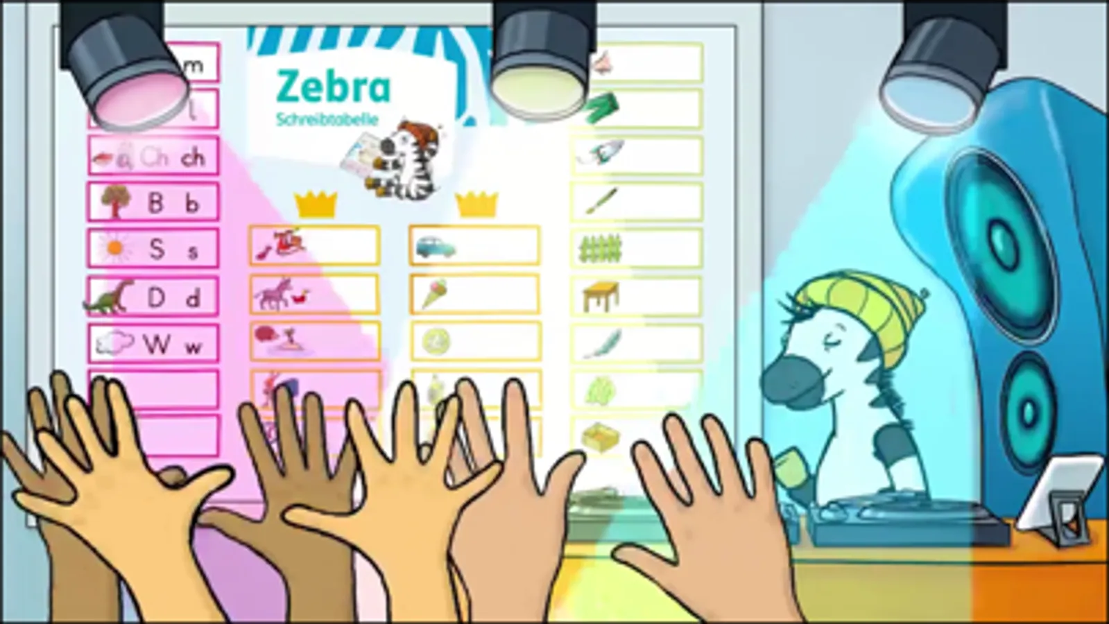 Zu Beginn können zwei Filme angeschaut werden. Im ersten Film können sich die Kinder mithilfe des Schreibtabellen-Raps mit der Schreibtabelle von Zebra vertraut machen. Der zweite Film zeigt, wie das Kind mit der Schreibtabelle arbeitet und wie es Schritt für Schritt lernt, Wörter zu schreiben.