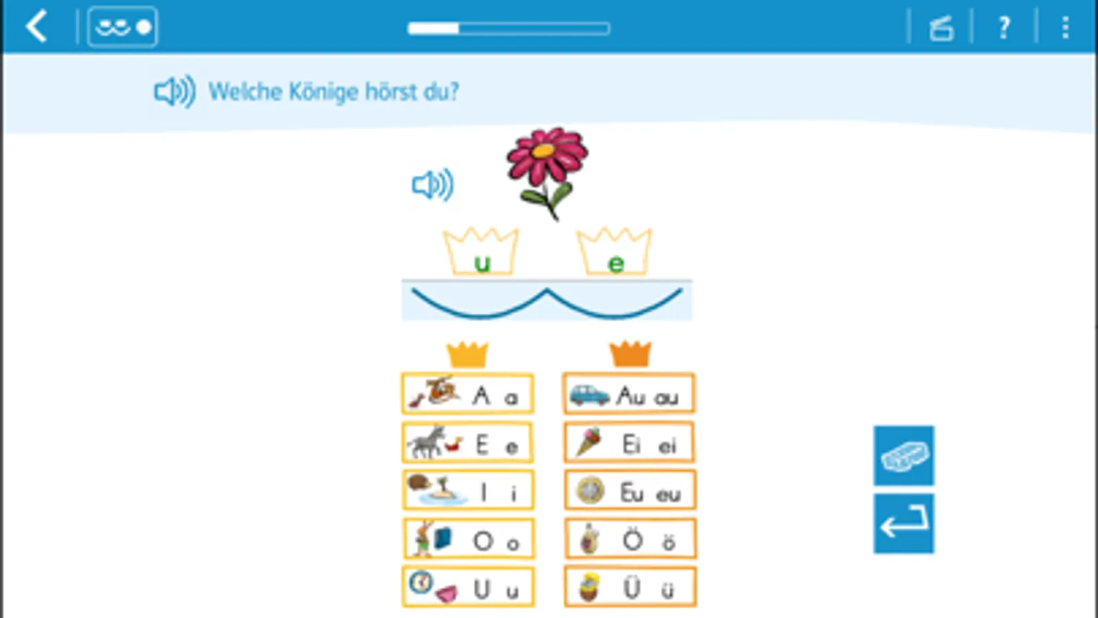 Bei den ersten beiden Kacheln muss das Kind genau hören, welche Könige in dem Wort enthalten sind, und dann die passenden Laute antippen.