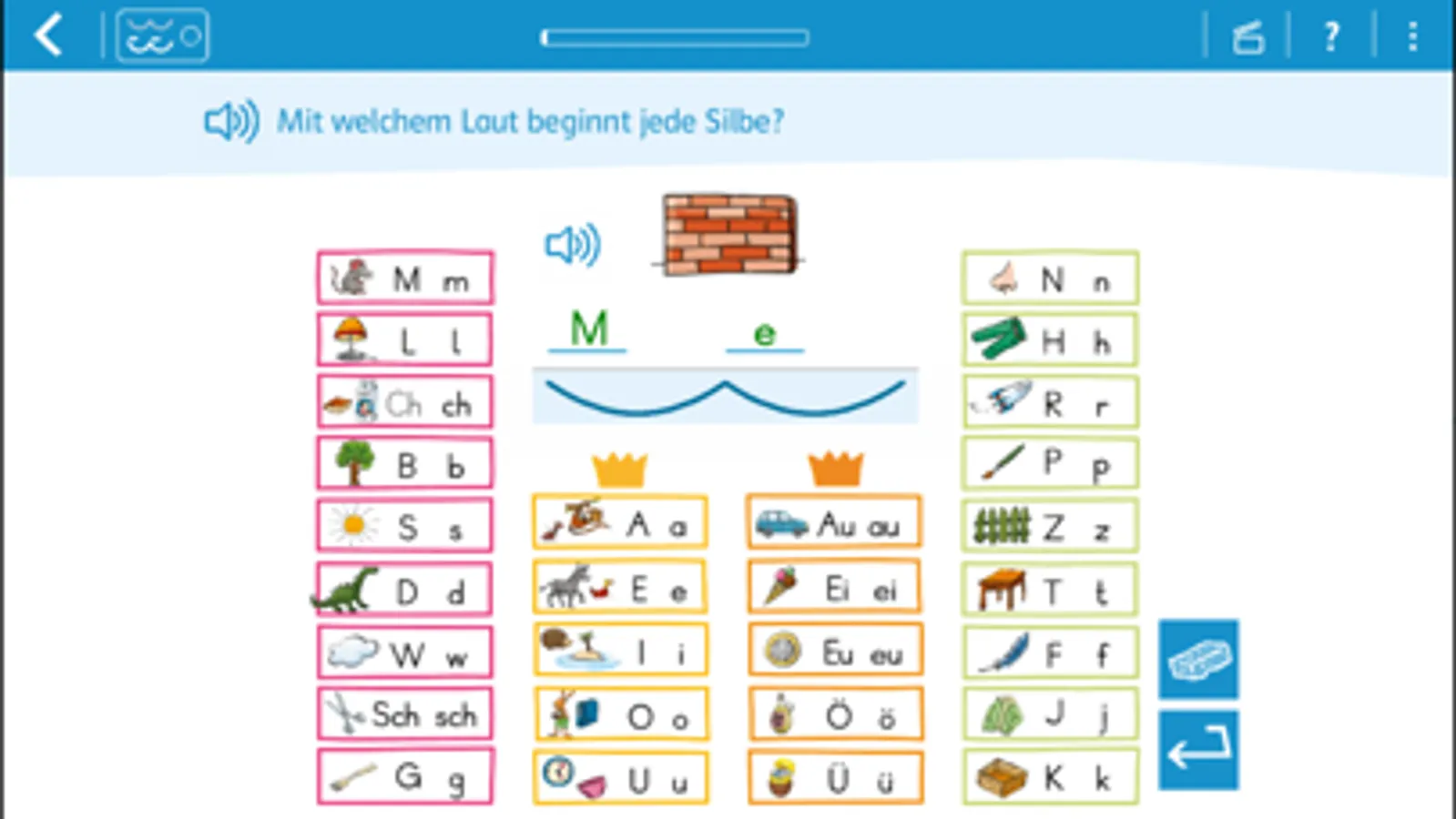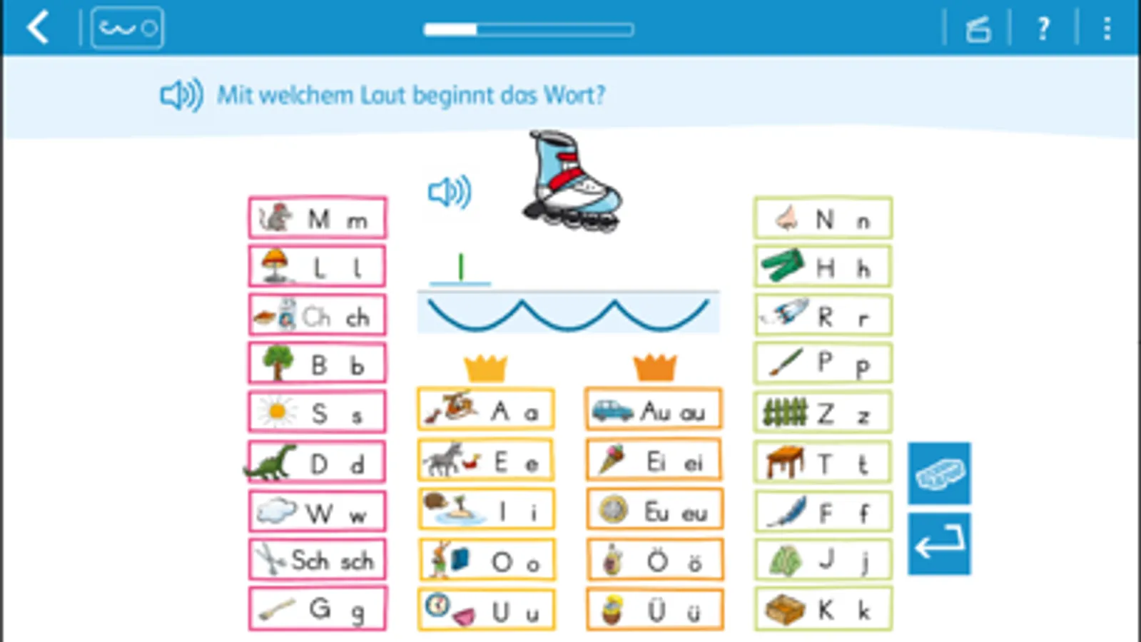 Hier muss das Kind genau hören, mit welchem Laut ein Wort beginnt, und dann den richtigen Laut antippen.