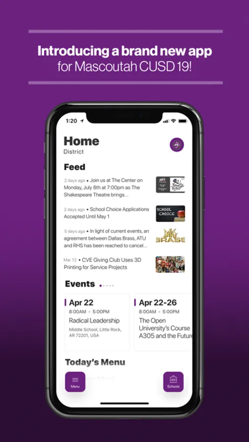 The event section shows a list of events throughout the district. Users can add an event to your calendar to share the event with friends and family with one tap.