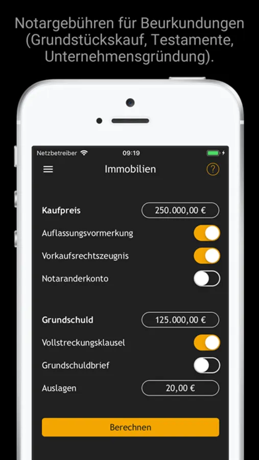 Für die in diesem Programm ermittelten Ergebnisse und weiterführenden Informationen wird keine Gewähr für Vollständigkeit und Richtigkeit übernommen. Für eine abschließende Ermittlung anfallender Gebühren und eine Beratung wenden Sie sich bitte an einen Notar Ihres Vertrauens.