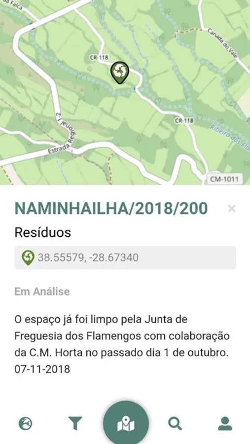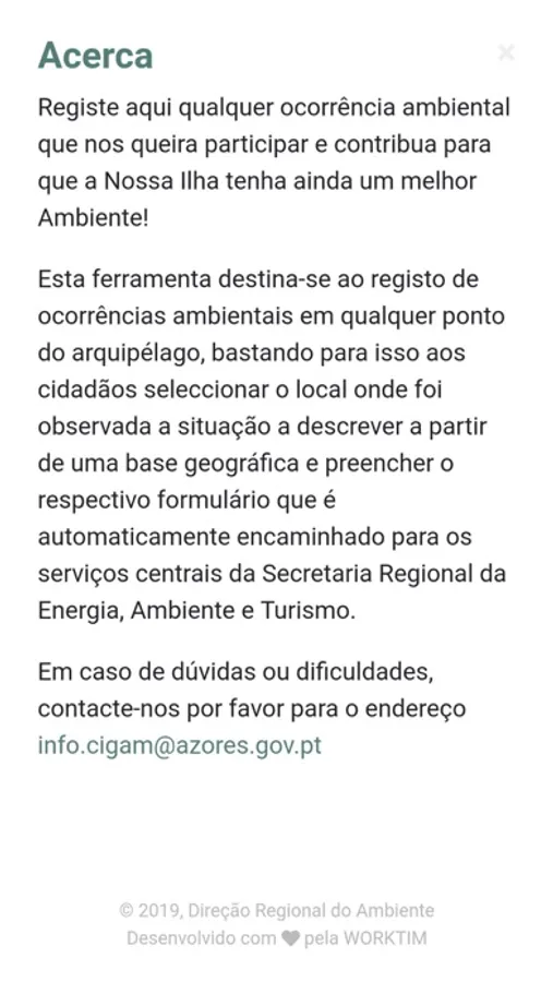 Esta ferramenta destina-se ao registo de ocorrências ambientais em qualquer ponto do arquipélago, bastando para isso aos cidadãos selecionar o local onde foi observada a situação a descrever a partir de uma base geográfica e preencher o respetivo formulário que é automaticamente encaminhado para os serviços centrais da Secretaria Regional da Energia, Ambiente e Alterações Climáticas