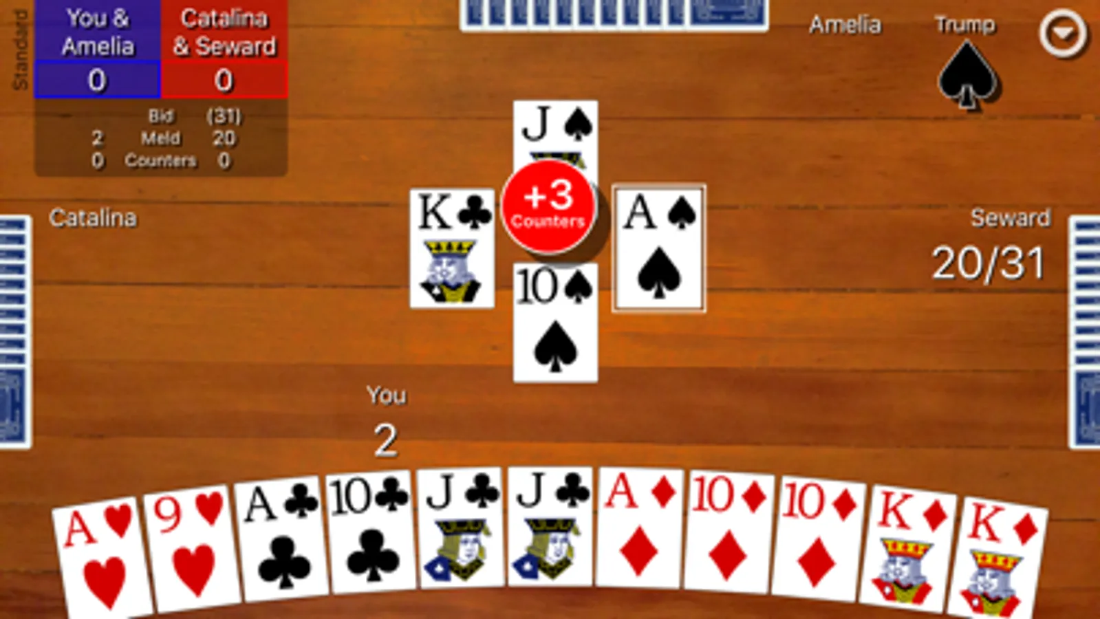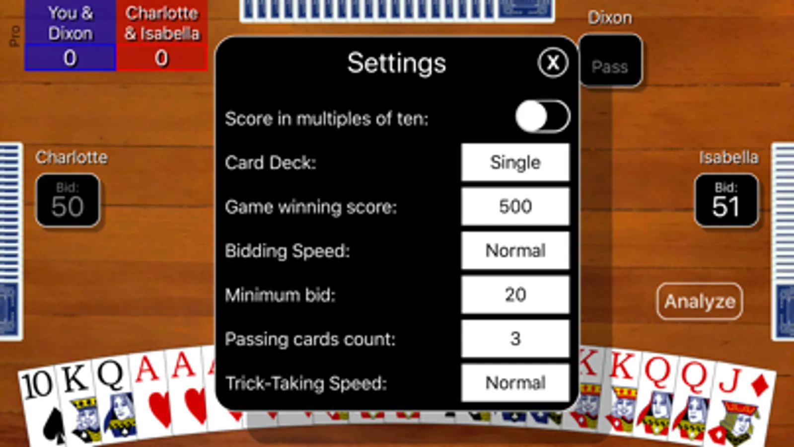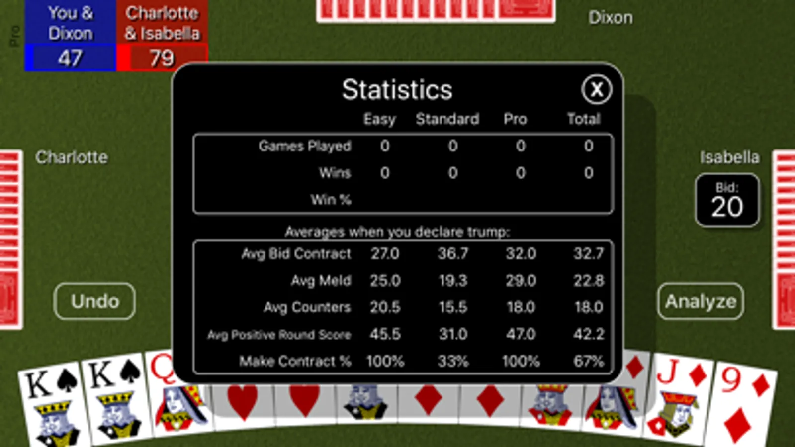 An analyze button can be turned on to help you evaluate your hand and pick a smart bid by simulating thousands of games and showing you likely round score outcomes. A hint button can be turned on to help you see what card the computer Pro player would play in your situation. Extensive statistics are kept for wins/losses, average contract, average meld, and average counters and success rate in making your bid.