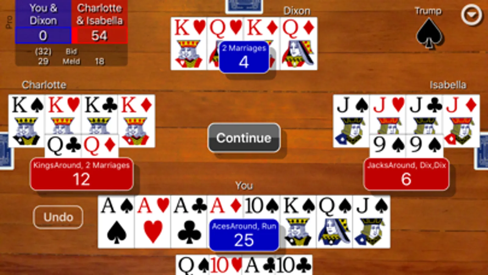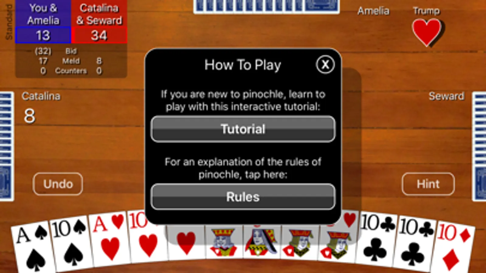If you are new to the game, Pinochle Classic has an interactive tutorial to teach you how to play by guiding you through a single round of a game.
