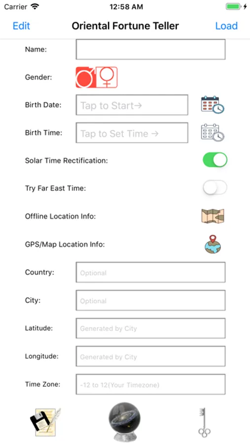 For beginners, just input your birthday and birth time and then tap the "Crystal Ball" to get your natal Four-pillar chart. And then, tap the "Expand" button to unfold the hidden symbols.