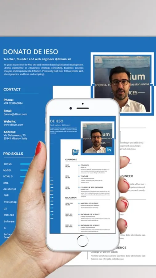Thanks to the Augmented Reality, in fact, a new possibility of enjoyment of the CV is born. Your photo begins to animate and speak, telling much more than a simple curriculum can do.
