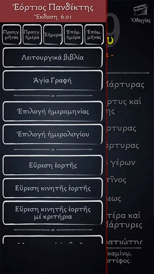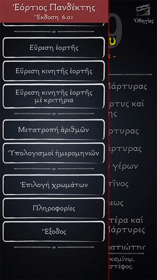 -Δυνατότητα αναζήτησης κάποιου αγίου ή κάποιας εορτής. Ο χρήστης εισάγει μερικά γράμματα από το όνομα του αγίου και το πρόγραμμα εμφανίζει όλες τις αντίστοιχες εορτές για να επιλέξετε ποια θέλετε.