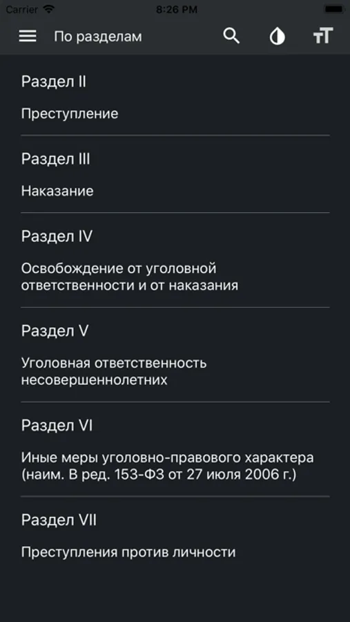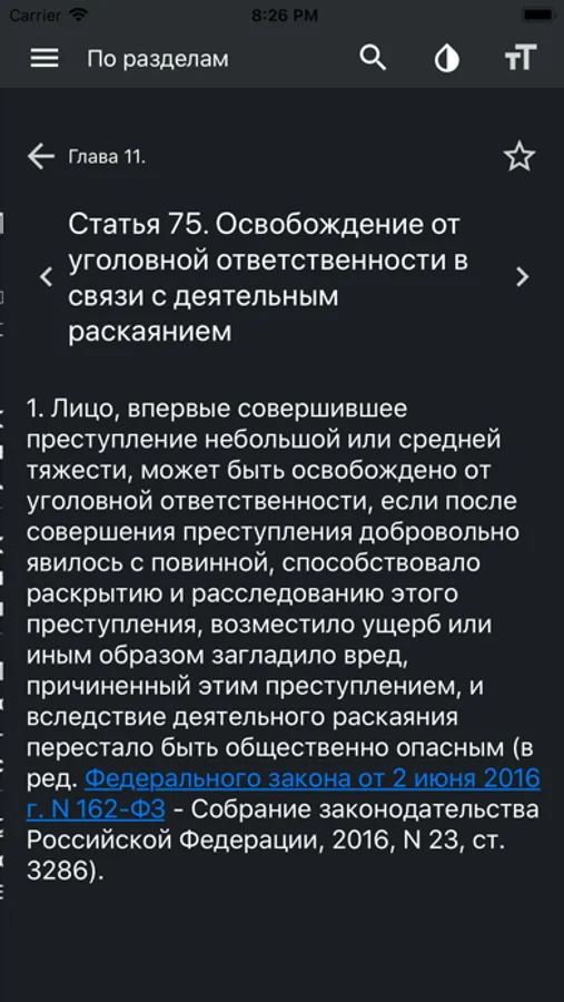Перелистывание между статьями вправо-влево, аналогично разделы и главы