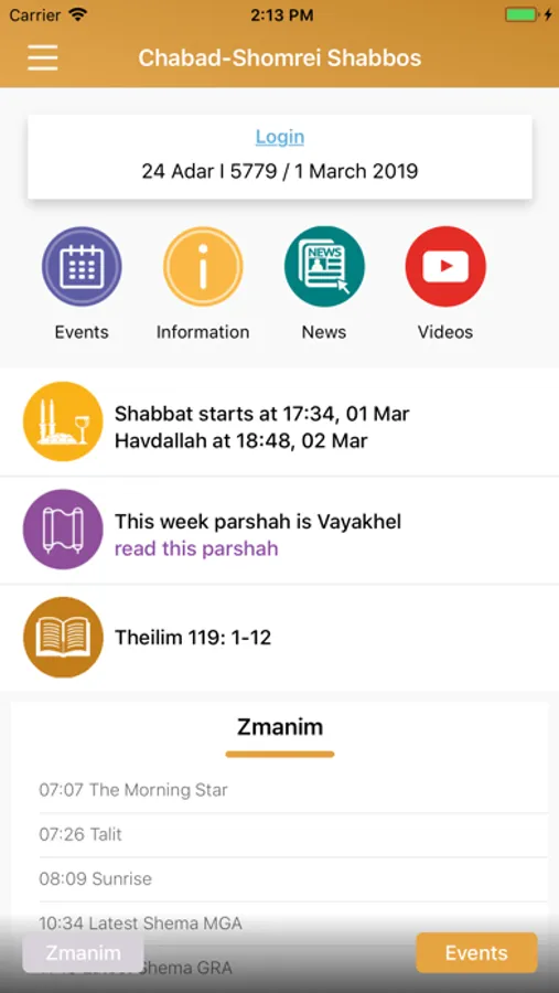 Halachic times, prayer times, lessons and video recordings of lessons, fahrbrengens, youth and holiday events, news of the community life and much more.