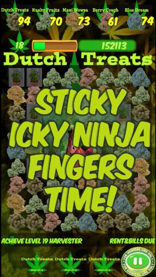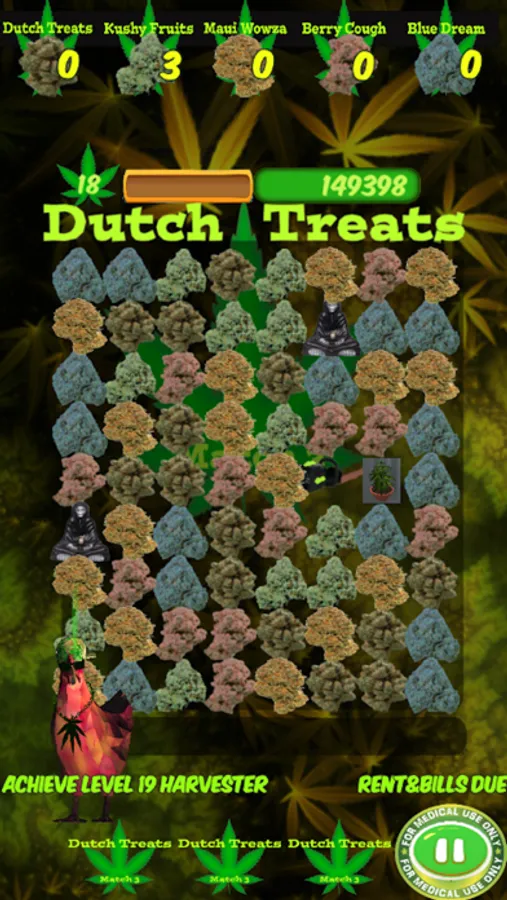 Dutch Treats Match 3 a very unique match game! Own your own Medical marijuana grow facility. Start off small and "GROW" to industrial size facilities. In a Match 3 style game collect your harvest! Many special gems to grab on the way!