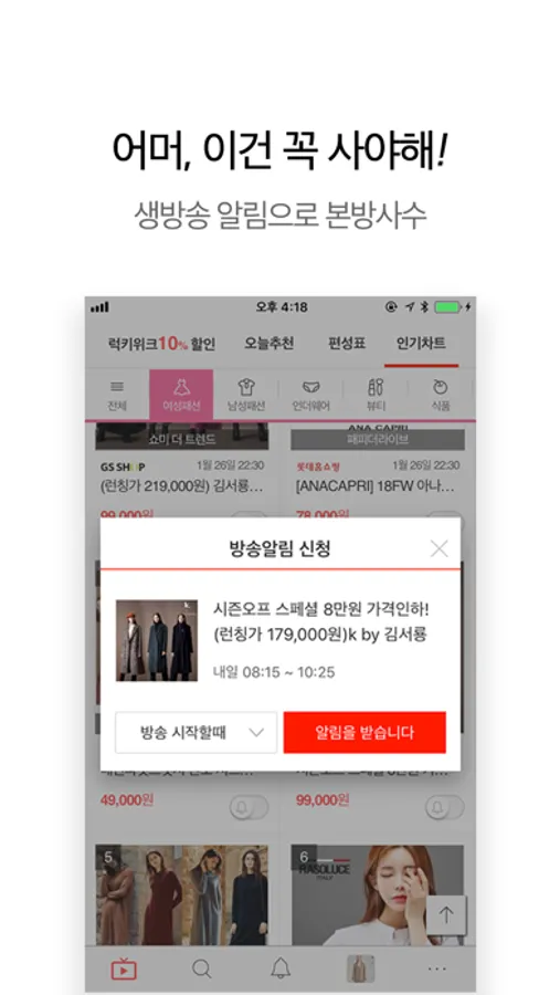 - 미리 선택한 생방송 시간을 알려주는 생방송 알림서비스로 생방송 혜택 놓치지 마세요.