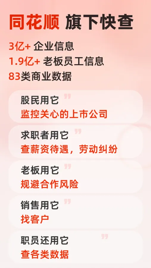 快查是同花顺旗下APP,一款专业的查企业信息的软件。专注于企业信息背景征信查询以及企业风险内幕挖掘,为各界人士提供丰富、客观的企业背景、风险、经营、资质许可等信息数据,更是各界商务人士使用的企业征信利器。