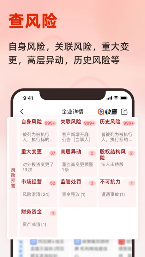 企业风险内幕模块:426项数据免费查,公司合作、银行放贷、选股诊股之前来快查免费查询风险内幕。