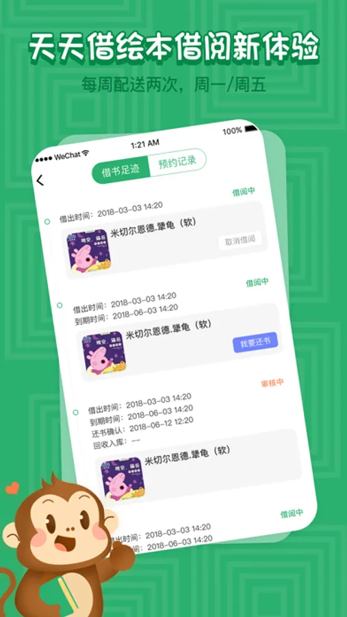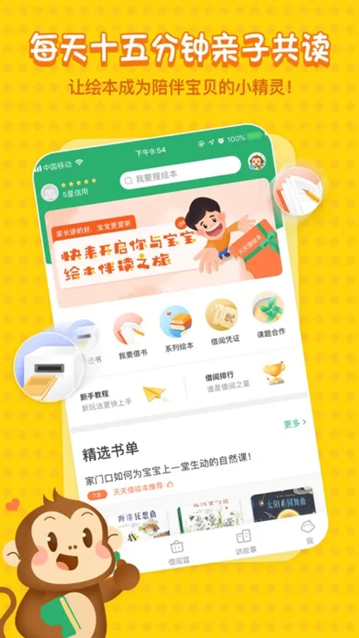 天天借绘本是映月读书旗下的专注于儿童绘本的互联网借阅共享平台,一款协助幼儿家长借阅图书的工具。为家长提供图书资源借阅渠道,实现线上借书、线下用书、自助还书。提供种类全面精美的中英文原版绘本借阅服务,定期更新绘本种类,是幼师和家长们的育儿资源库!是目前服务最好、种类最齐全的儿童绘本阅读“内容+服务+渠道”综合运营提供商。天天借绘本,让您的孩子爱上阅读!